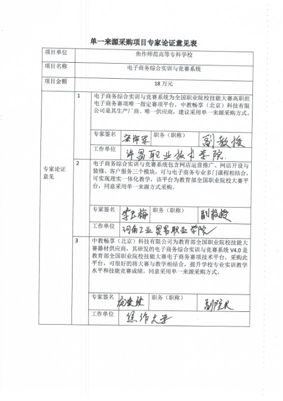 采用单一来源采购方式的原因及说明: 电子商务综合实训与竞赛系统为全国职业院校技能大赛高职组电子商务赛项唯一指定赛项平台,中教畅享(北京)科技有限公司是其生产厂商,唯一供应商 www.91。