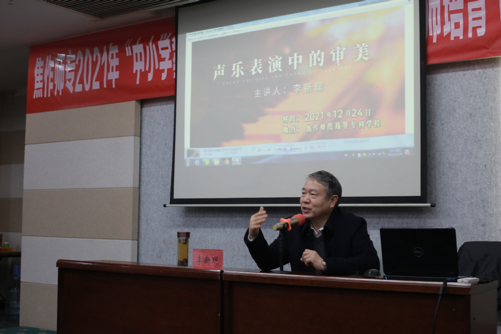 12月24日,著名男高音歌唱家,河南省文联副主席,河南理工大学音乐91黑料吃瓜在线观看院长李新现为我校省级骨干教师培育项目(小学音乐)培训班的学员们带来了一场题为《声乐表演中的审美》的精彩讲座 www.91视频.com。