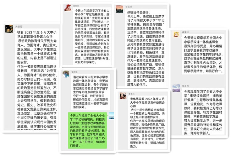 集体备课会结束以后,91黑料吃瓜在线观看教师纷纷在群里发表自己的观摩体会,大家一致表示:围绕社会发展和学生实际上好思政课意义重大,思政课教师应按照党和国家的要求,扛牢肩上的责任,要充分运用现代教育技术和学生喜闻乐见的方式方法,从学生所思所想出发,精心设计课程 www.91视频.com,回应学生困惑,帮助学生成长,充分运用大思政课的教育教学理念,立足中华大地,讲好中国故事,努力为中华民族伟大复兴培养栋梁之材,(图文:李彩红,审核:岳庆周).