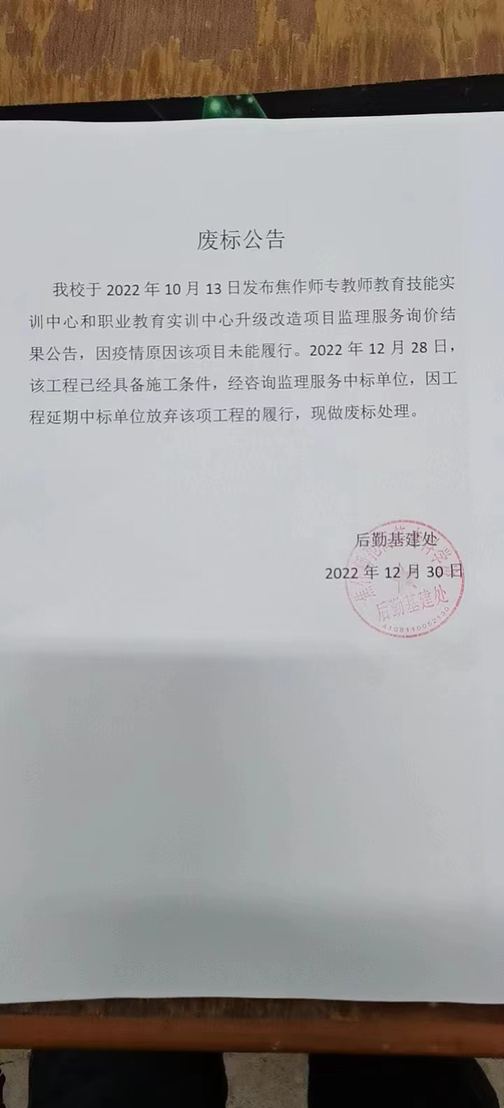 我校于2022年10月13日发布焦作师专教师教育技能实训中心和职业教育实训中心升级改造项目监理服务询价结果公告,因疫情原因该项目未能履行,2022 年12月28 日该工程已经具备施工条件,经咨询监理服务中标单位,因工程延期中标单位放弃该项工程的履行,现做废标处理 www.91视频.com。