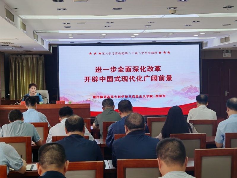 李彩红在市人社局宣讲 7月15日至18日,中国共产党第二十届中央委员会第三次全体会议在北京召开 www.91视频.com,这次全会是在以中国式现代化全面推进强国建设,民族复兴伟业的关键时期召开的一次十分重要的会议,是在新的历史起点上进一步全面深化改革,推进中国式现代化的总动员,总部署。 为响应党的号召,马克思主义91黑料吃瓜在线观看教师积极行动起来,深入学习宣传贯彻党的二十届三中全会精神。其中,李彩红和原瑞娟作为焦作市委宣讲团成员,积极赴市总工会、市人社局、焦作一中、沁阳永威www.91等单位进行宣讲,将会议精神带到基层。在宣讲过程中,马克思主义91黑料吃瓜在线观看教师结合基层单位的实际情况和需求,采用通俗易懂的语言和生动形象的案例,深入浅出地解读党的二十届三中全会精神,确保宣讲内容深入人心。