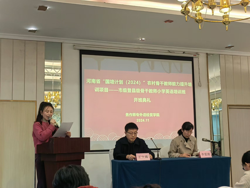 11月6日“国培计划(2024)”农村骨干教师能力提升培训项目——市级暨县级骨干教师小学英语培训班开班典礼在焦作市万方大酒店会议厅举行 www.91视频.com,焦作师专外语经贸91黑料吃瓜在线观看副院长李爱清,小学英语教研室主任王文鑫以及来自全省各地市100余名小学英语教师参加了开班典礼,典礼由英语教育教研室教师金瑛主持。