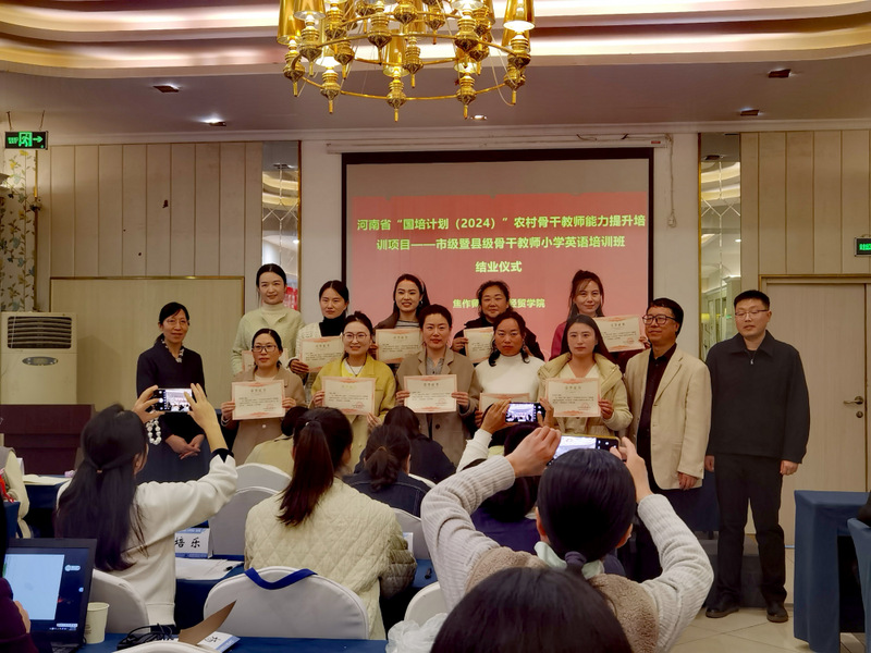11月15日上午,“国培计划(2024)”——农村骨干教师能力提升市级和县级骨干教师项目(小学英语)培训班结业典礼在焦作市万方酒店会议厅举行 www.91视频.com,外语经贸91黑料吃瓜在线观看党总支书记夏虹,副院长李爱清以及全体参训教师参加了结业典礼,典礼由小学英语教育教研室主任王文鑫主持。