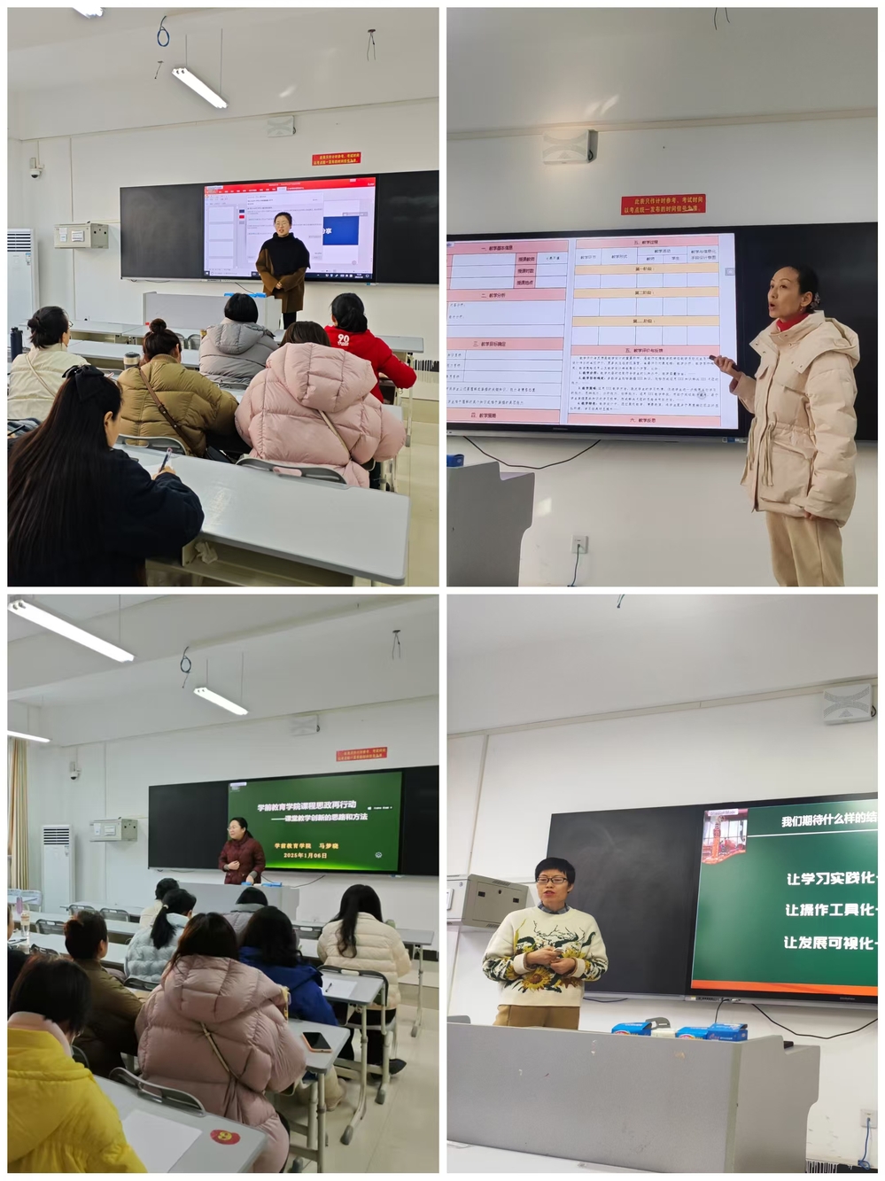 活动期间,副院长马梦晓以《课程思政再行动——课堂教学创新的思路与方法》为题,聚焦学生课堂学习状况,向全体教师分享了如何将育人理念与创新行动有机融入教学实践的思路及方法,孟微老师全面剖析了课程思政的内涵,意义与设计逻辑,且以实际案例为依托 www.91,阐释了课程思政融入课堂教学的行动路径与策略,杜利娜老师作为《幼儿游戏》课程团队代表,与大家交流了2025年度教师教学能力大赛参赛作品的整体构思与具体举措,并开展了深入研讨,洪雅楠老师分享了自身参赛获奖的经验与心得体会,为其他教师参赛提供了建议和思路,此外,围绕 “课堂教学创新模式” 以及 “课程思政实践深化” 两大方向,各个课程小组借助结构化研讨,说课示范等形式,扎实开展了研课磨课活动。