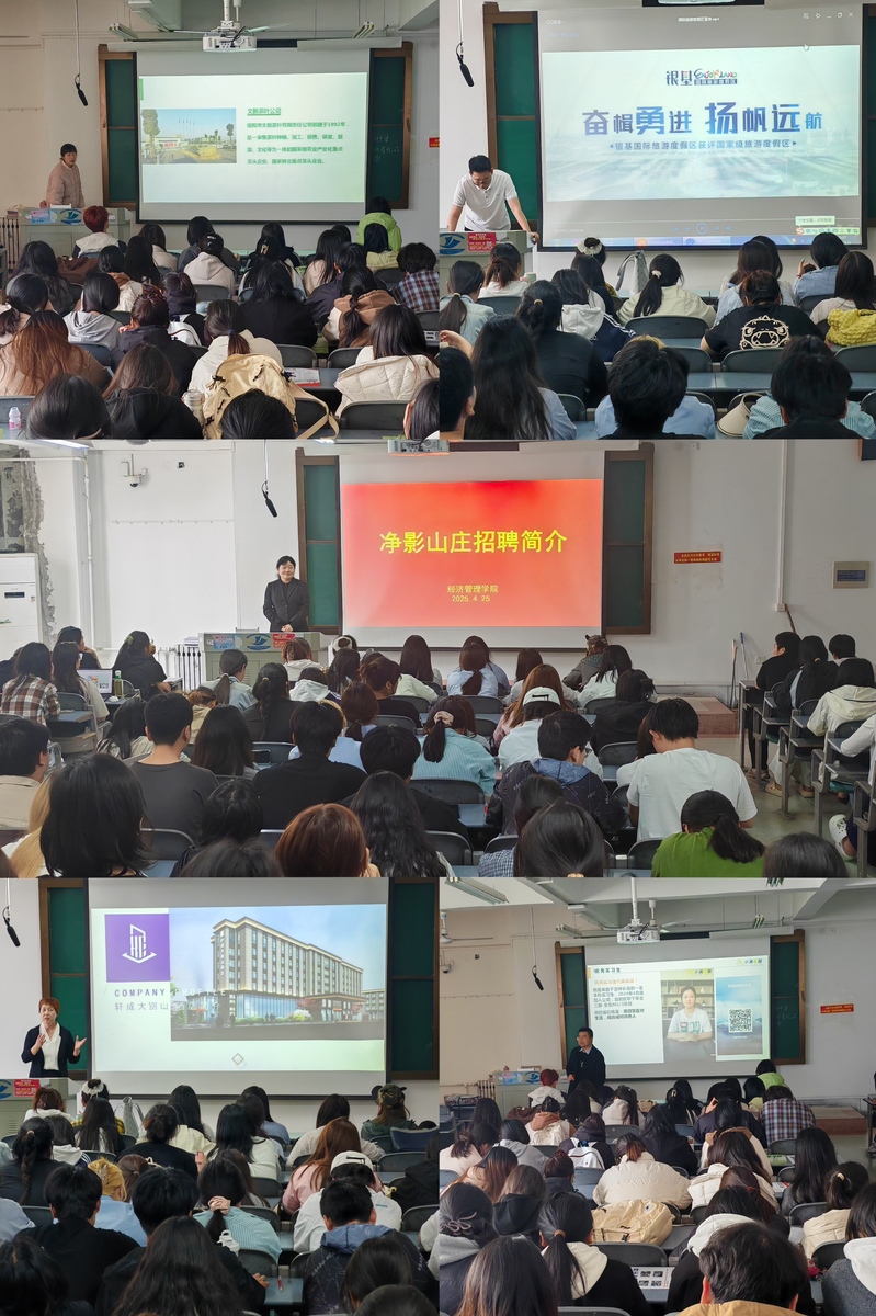 4月25日下午,经济管理91黑料吃瓜在线观看在二教413教室举办“实习就业双选会”,河南银基国际旅游度假区管理有限公司,信阳市文新茶叶有限责任公司,小满金服金融科技公司,焦作轩成大别山酒店,焦作净影山庄酒店五家企业进校开展招聘,为在校生提供实习岗位 www.91视频.com,并向应届毕业生开放招聘通道,活动吸引200余名学生参与。