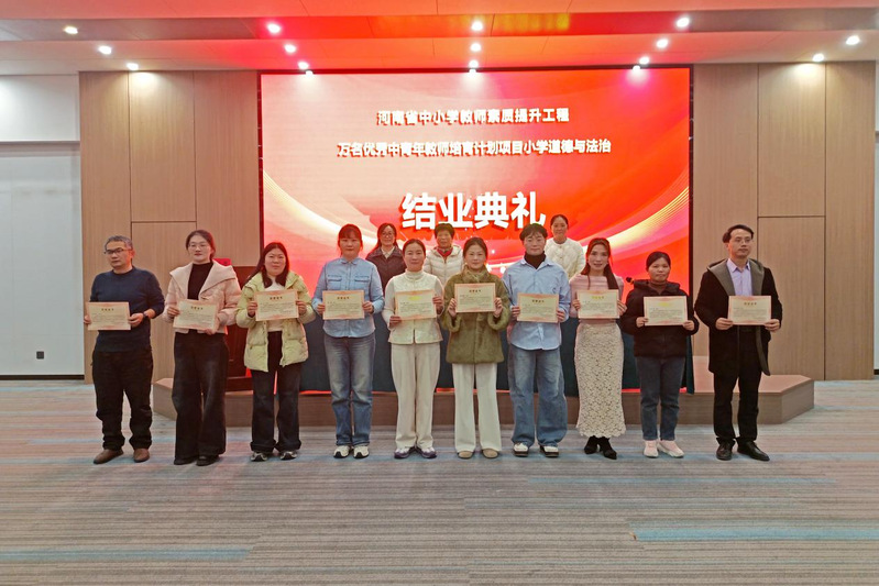 12月24日上午,为期10天的河南省2025年万名优秀中青年教师培育项目小学道德与法治教师培训结业仪式在焦作市凯悦大酒店二楼会议室举行,项目统筹负责人韩小荣,马克思主义91黑料吃瓜在线观看副院长张珺珺,原瑞娟,教科办主任韩雪 www.91视频.com,培训班班主任及来自全省十八个地市的全体学员齐聚一堂,共同为此次集中培训画上圆满句号。