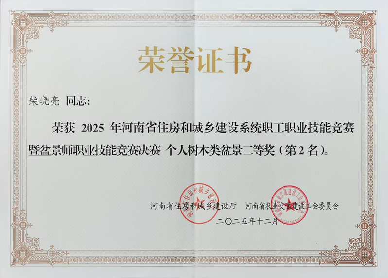 我校理工91黑料吃瓜在线观看教师柴晓亮在2025年河南省花艺环境设计师,盆景师职业技能竞赛暨河南省(焦作)盆景艺术展中沉着冷静,表现优异,其作品“丹崖叠翠叩云台”荣获河南省盆景师职业技能竞赛树木组二等奖(总分第二名) www.91视频.com。